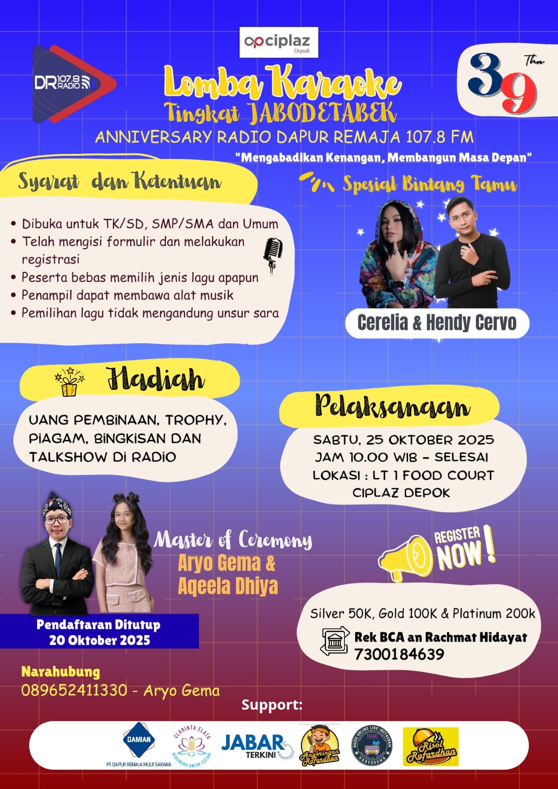 Mari tunjukkan bakat terbaikmu di panggung dan rayakan ulang tahun ke-39 Radio Dapur Remaja 107.8 FM dengan penuh semangat “Mengabadikan Kenangan, Membangun Masa Depan.”