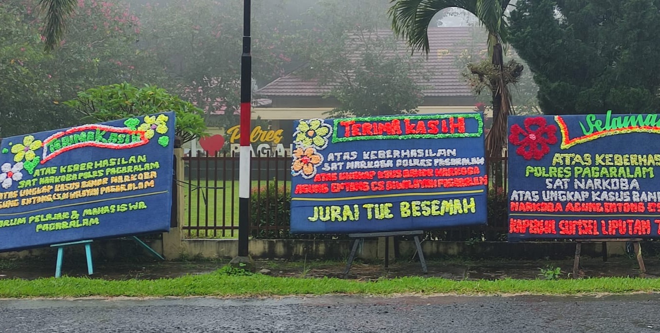 Kasi Humas Polres Pagaralam Iptu Mansyur SH menambahkan, keberhasilan ini tidak lepas dari peran aktif masyarakat yang berani memberikan informasi. “Kami ucapkan terima kasih atas dukungan warga. Mari bersama kita jaga Kota Pagaralam dari bahaya narkoba. Polres Pagaralam berkomitmen terus memberantas peredaran narkotika sampai ke akar-akarnya,” ujarnya. Sejumlah papan bunga ucapan selamat pun turut berjejer di depan Mapolres sebagai bentuk apresiasi masyarakat atas keberhasilan jajaran Satresnarkoba.